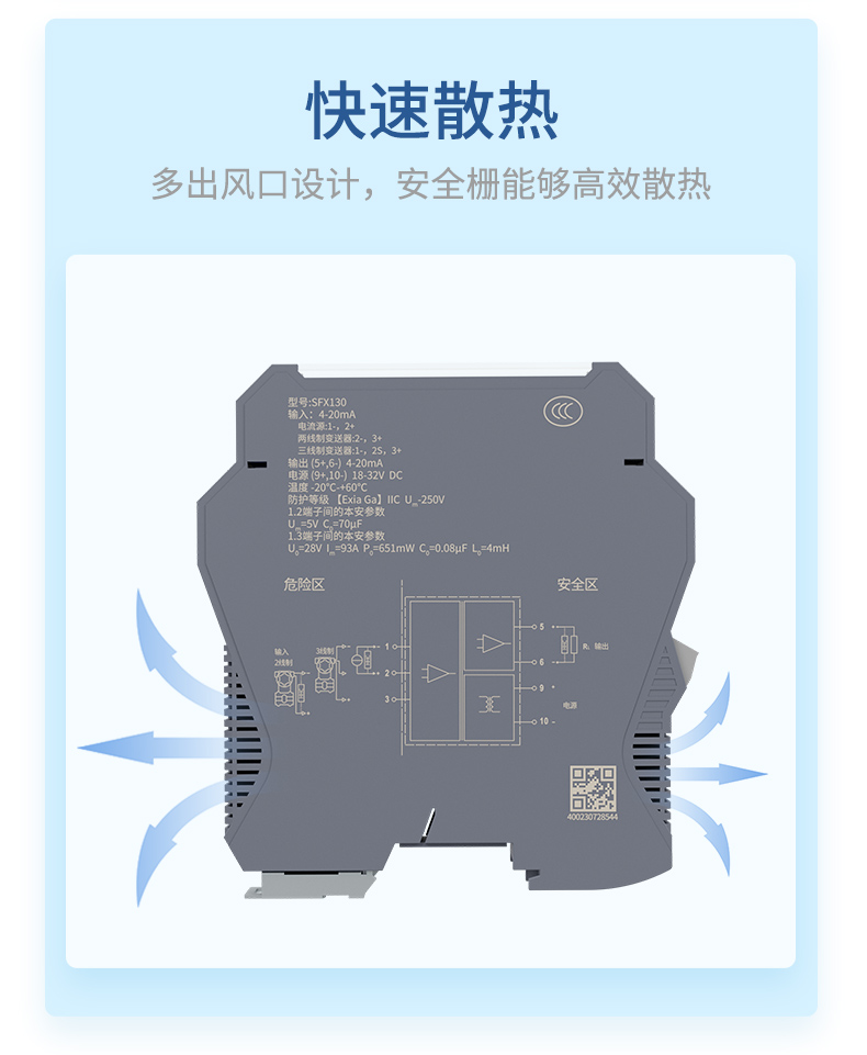 隔離式安全柵向危險區的變送器提供隔離的工作電源,同時檢測回路中的電流,經隔離變送輸出電流或電壓信號到安全區。