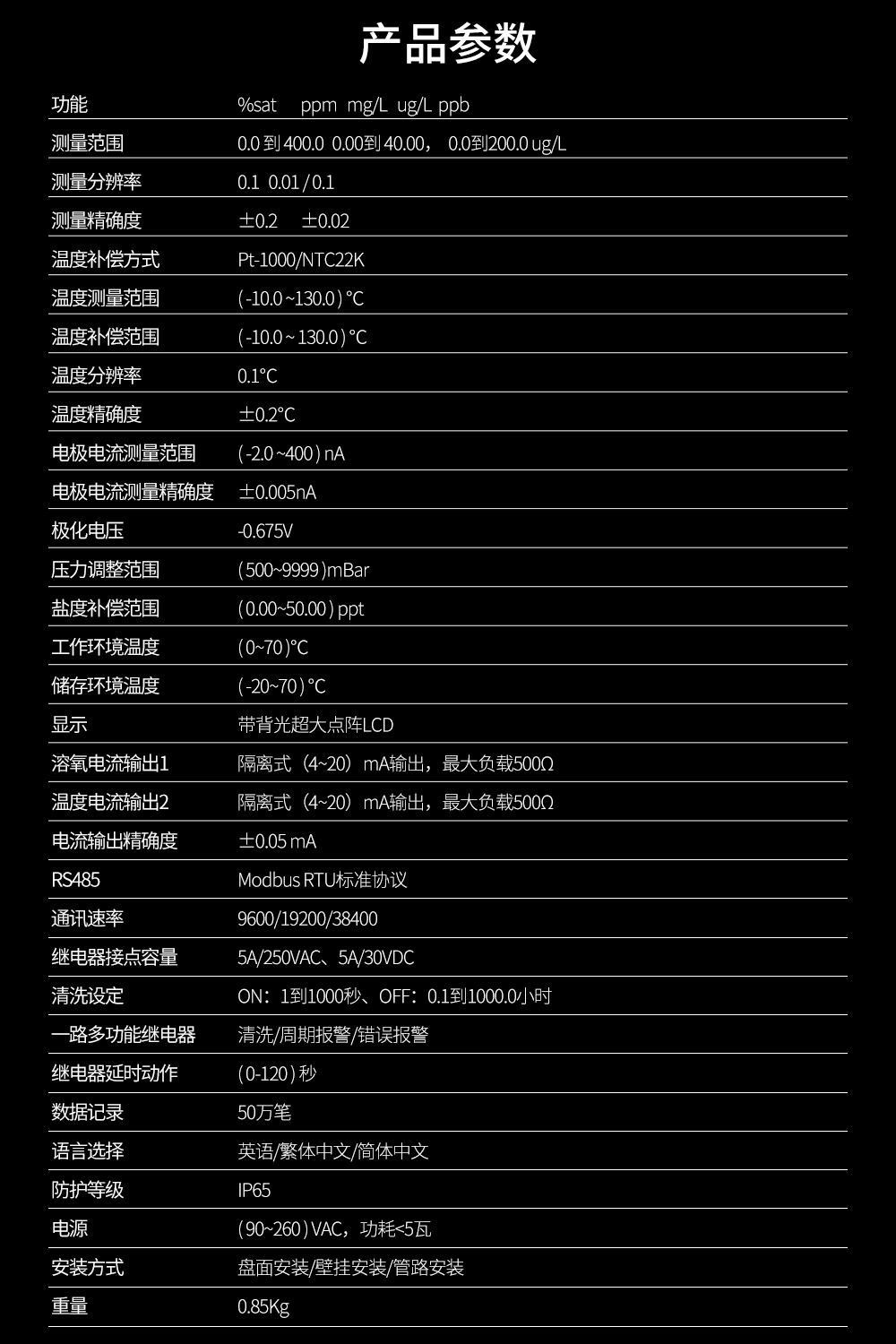 儀器用于工業(yè)上溶氧%/ppm/mgL/ugL/ppb 及溫度的測量,如:發(fā)酵,飲用水,鍋爐水,海水,養(yǎng)殖,水族館,地表水,工業(yè)污水,都市廢水,環(huán)境監(jiān)測,食品生產(chǎn)過程等,儀器可以盤面安裝,壁掛安裝,管路安裝,儀器提供 2 路電流輸出,最大負載為 500Ω,儀器提供 3 路控制用繼電器,繼電器最大承受電壓及電流為 5A/250VAC 或 5A/30VDC。CN2