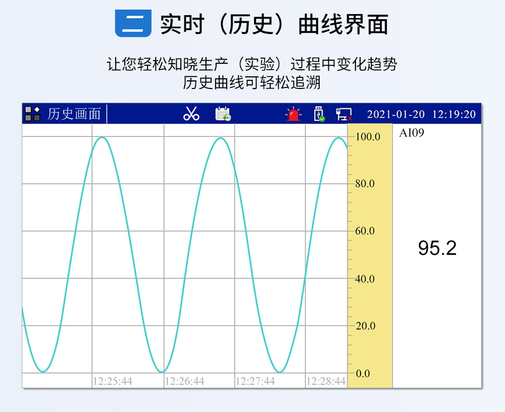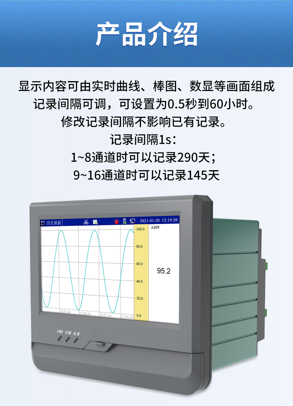 觸摸式彩色無紙記錄儀具有 60 個(gè)運(yùn)算函數(shù)、24 路模擬量輸入、3 路 開關(guān)量輸入、3 路脈沖量輸入、6 路模擬量變送輸出、16 路開關(guān)量輸出, 可實(shí)現(xiàn)運(yùn)算、顯示、記錄、報(bào)警、分析統(tǒng)計(jì)報(bào)表、高速采樣等功能,通 過 RS-232/RS-485 和以太網(wǎng)通訊接口,可實(shí)現(xiàn)遠(yuǎn)程實(shí)時(shí)監(jiān)控、組態(tài)管理、 歷史數(shù)據(jù)讀取等功能,通過 U 盤可實(shí)現(xiàn)組態(tài)管理、監(jiān)控畫面管理和歷史 數(shù)據(jù)管理等功能。CN4