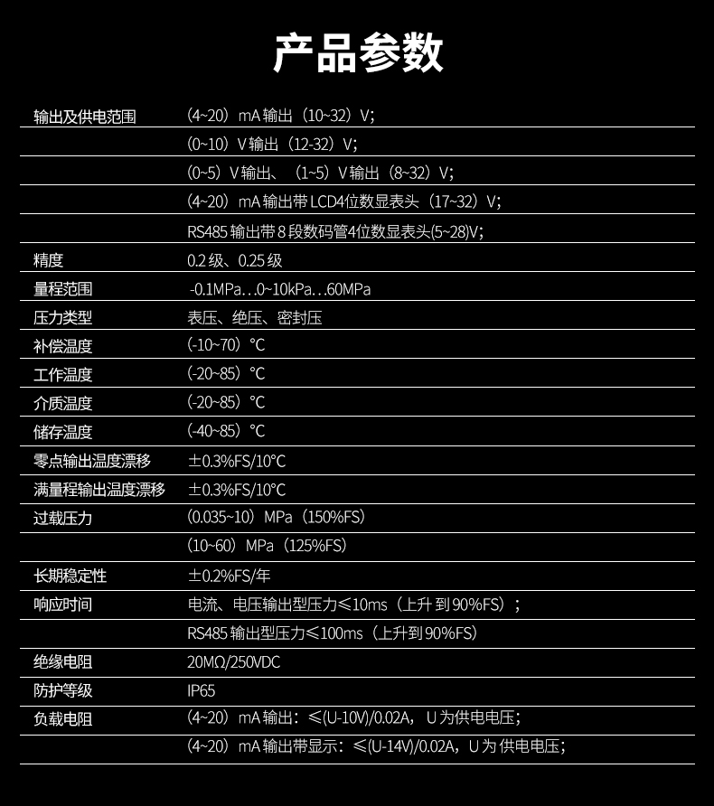 擴散硅壓力變送器選用進口高精度、高穩(wěn)定性壓力 敏感芯片。敏感芯片采用先進的微機械刻蝕加工工藝, 通過在硅片上擴散四個高精度電阻,從而形成惠斯通電 橋。由于壓阻效應(yīng),四個橋臂電阻的阻值發(fā)生變化,電 橋失衡,敏感元件輸出一個對應(yīng)壓力變化的電信號。輸 出的電信號通過 24 位 AD 數(shù)字芯片的放大和非線性矯正 的補償,產(chǎn)生與輸入壓力成線性對應(yīng)關(guān)系的電壓、電流 信號。CN6
