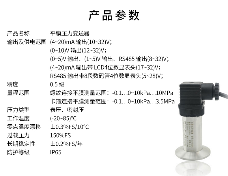 平膜結構壓力變送器采用波紋膜直接感受壓力。傳 感器平膜片防止了污垢,不衛生及粘稠液體堵塞等問題。 具有體積小、重量輕、長期穩定性好等特點,廣泛應用 于食品、醫藥、衛生及釀酒工業等行業。CN5