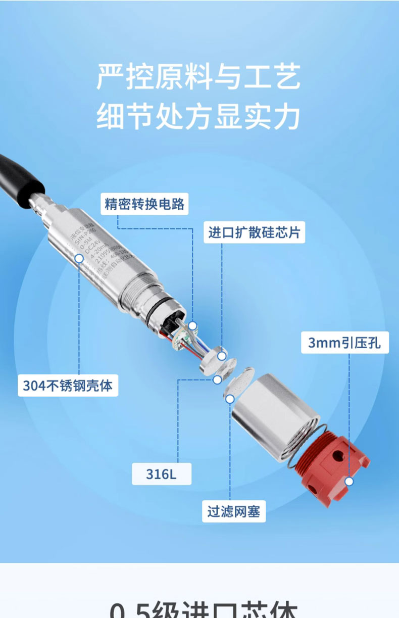 投入式液位變送器由高性能擴(kuò)散硅壓阻式壓力傳感器作為測(cè)量元件,把與液位深度成正比的液體靜壓力準(zhǔn)確測(cè)量出來(lái),并經(jīng)過(guò)信號(hào)調(diào)理電路轉(zhuǎn)換成標(biāo)準(zhǔn)(電流或電壓)信號(hào)輸出,建立起輸出信號(hào)與液體深度的線性對(duì)應(yīng)關(guān)系,實(shí)現(xiàn)對(duì)液體深度的測(cè)量。產(chǎn)品精度高、體積小,直接投入液體中,即可測(cè)量出變送器末端到液面的液體高度,使用方便。適用于石油、化工、 電廠、城市供水、水文勘探領(lǐng)域的液位測(cè)量與控制。CN2